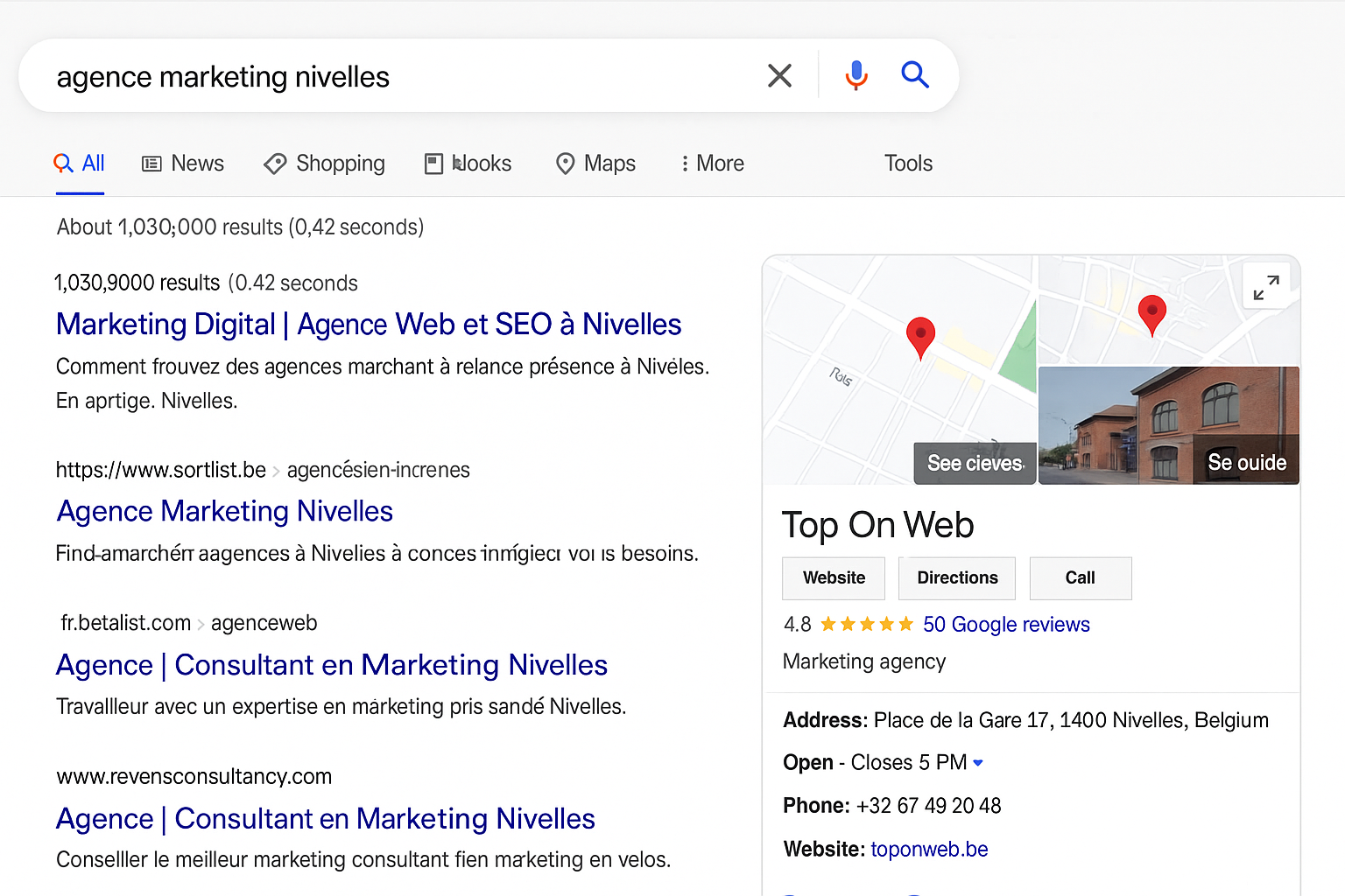 Exemple n°1 : quelqu’un tape « agence marketing Nivelles » sur Internet. Avant même de cliquer sur un site, il voit apparaître des fiches d’entreprises avec des informations à leur sujet : leur nom, une carte, des étoiles, des horaires, des photos, etc.