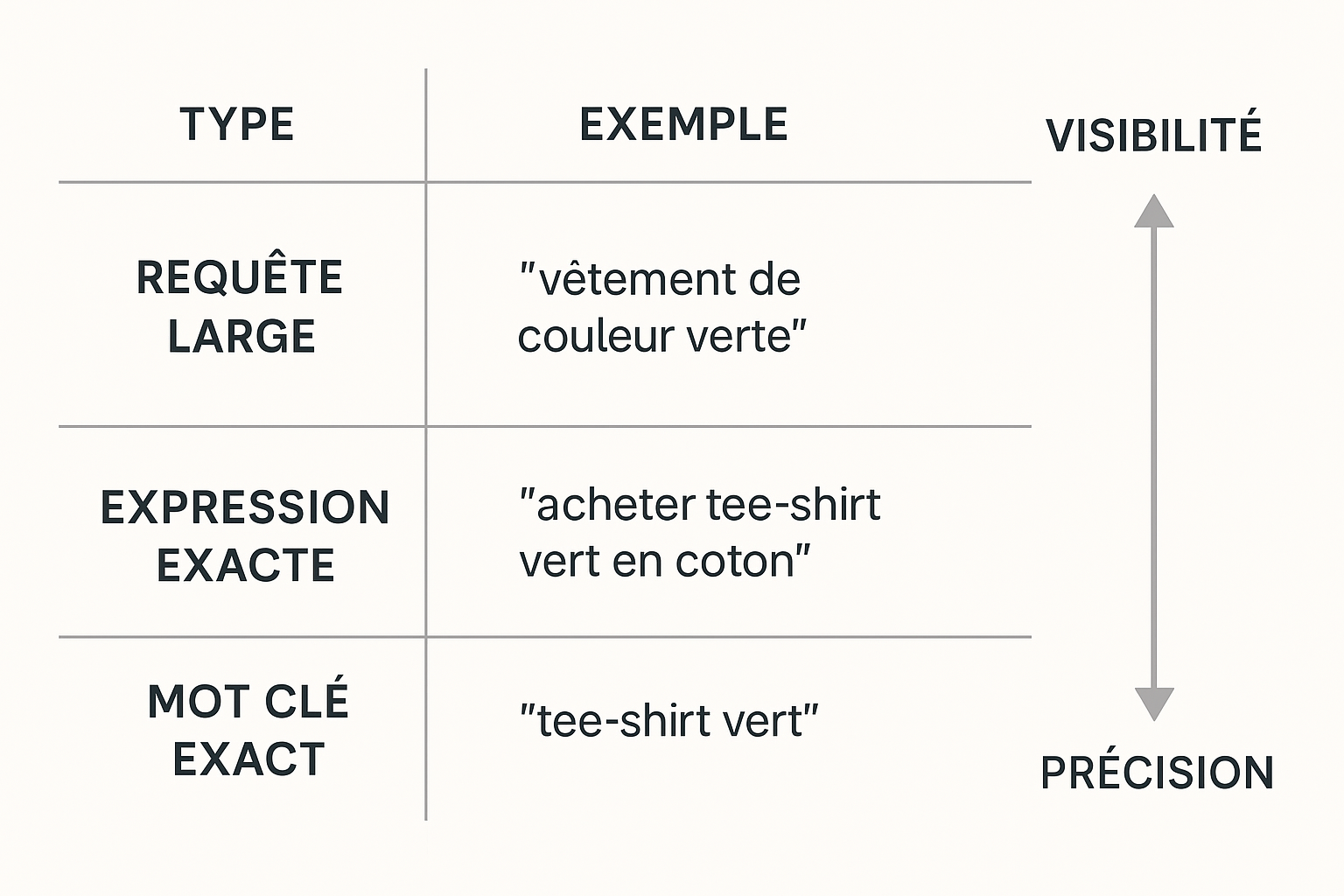 - L’expression exacte : votre annonce s’affiche si la recherche contient votre mot-clé, même avec quelques mots avant ou après. C’est un bon équilibre entre portée et précision.