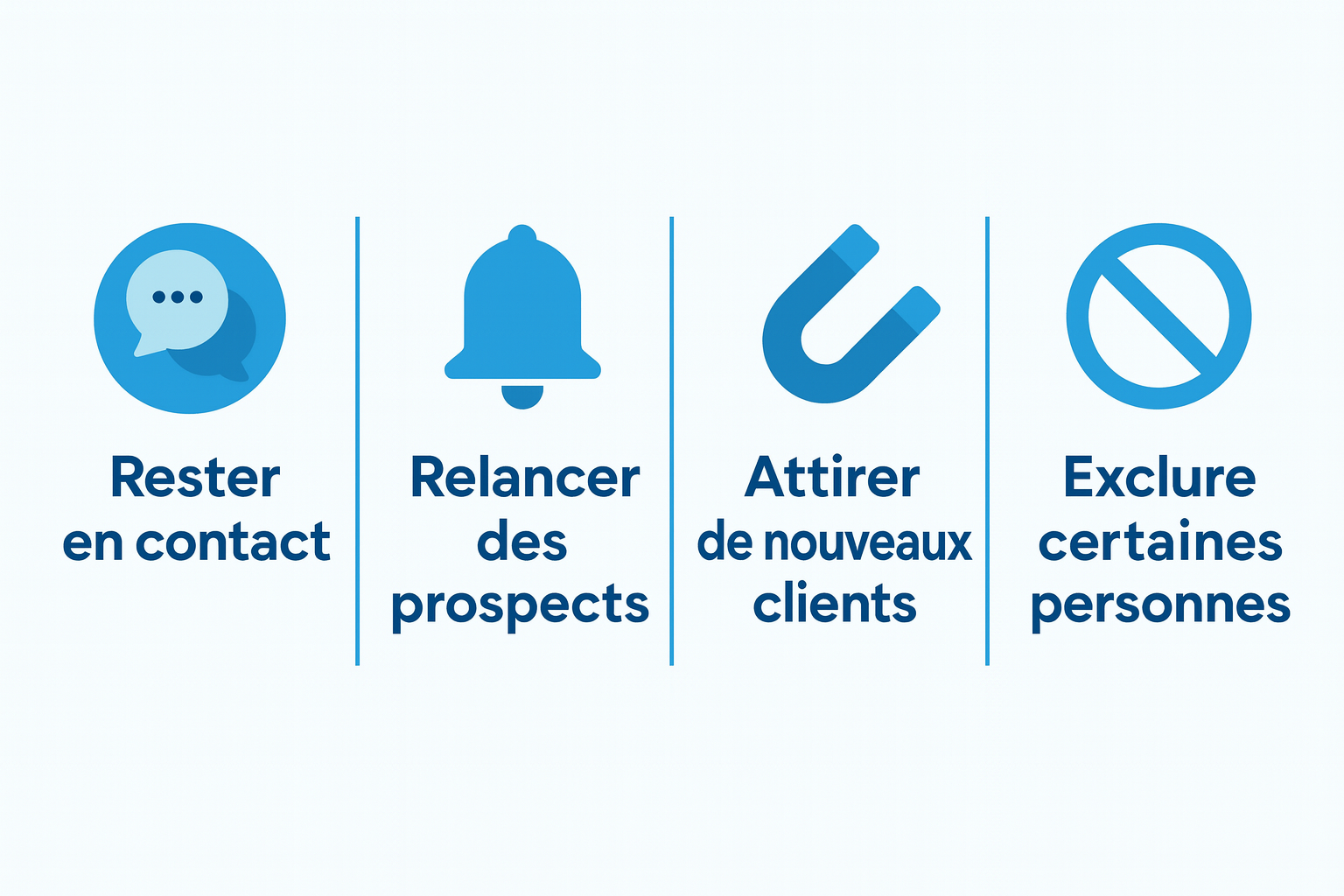 À l’inverse, cette technique permet aussi d’éviter de montrer certaines annonces publicitaires à ceux qui ne sont pas concernés. Par exemple, vous pouvez choisir de ne pas afficher une offre de bienvenue à quelqu’un qui est déjà client. Cela permet de mieux répartir votre budget, d’éviter les maladresses, et de proposer un message plus pertinent selon la situation de chacun.