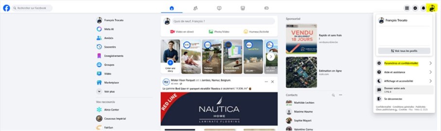 - Connectez-vous à votre compte Facebook personnel, puis cliquez sur votre photo en haut à gauche. Cliquez ensuite sur « Paramètres et confidentialité», puis sur « Paramètres »