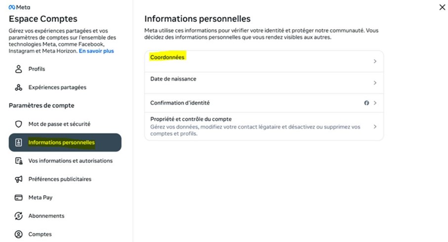 - Cliquez ensuite sur « Informations personnelles », puis « Coordonnées »