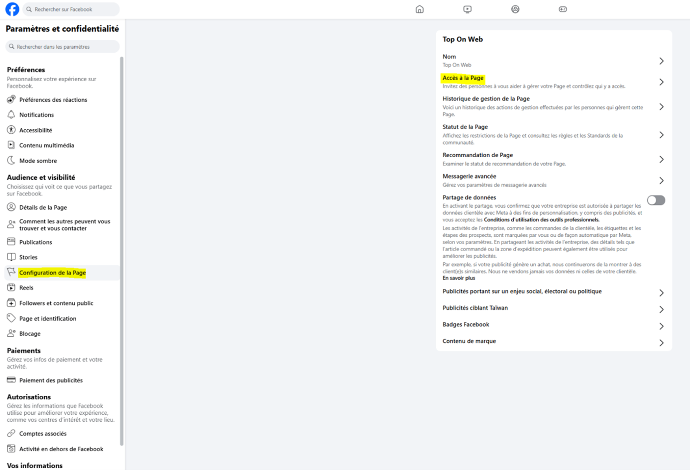 - Cliquez sur "Configuration de la page" puis sur "Accès à la Page" (ou “Rôles de la Page” selon l’interface).